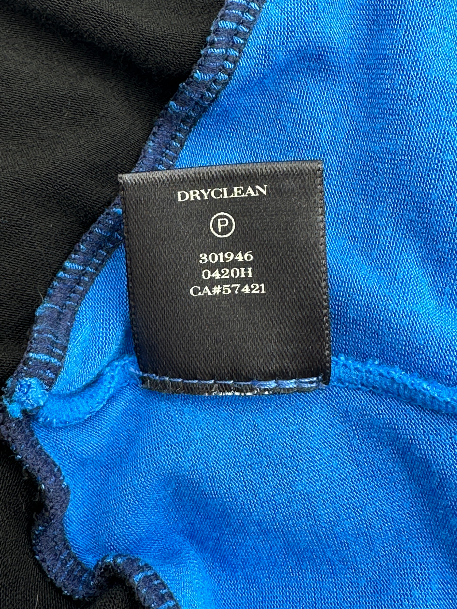 Description : A soft jersey-knit fabric in navy blue, royal blue and teal blue with black piping, belt and band at the bottom, a scoop neck, elastic waist band, shark bite hem (longer at each side), and a decent amount of stretch. Dry clean