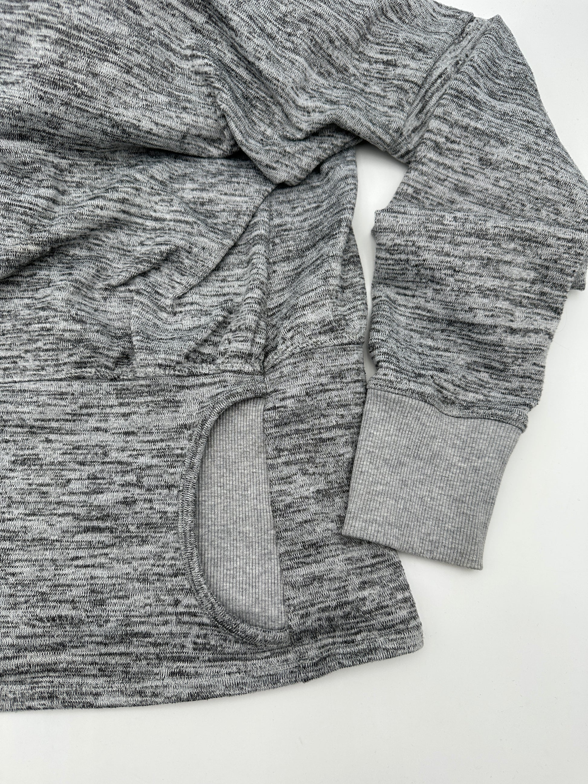 Description : A soft, pull over hoodie with a crossover neck, ribbed cuffs, kangaroo-style front pocket at the elasticized waist and a bit of stretch. Marled space dye effect, no fabric tag - machine wash cold, gentle cycle