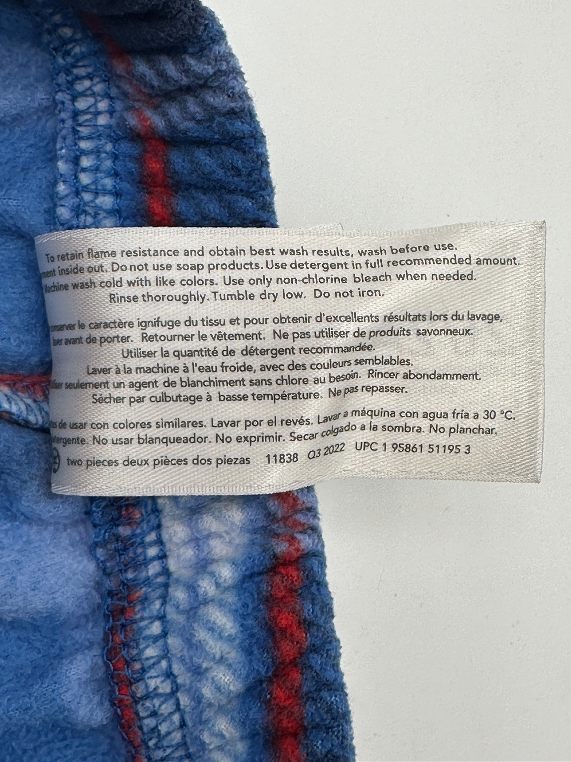 Description : A long sleeve tagless red shirt top with a screened sheep dog on the front, and coordinating blue with red and white plaid fleece pull-on pants with an elastic waist and open legs