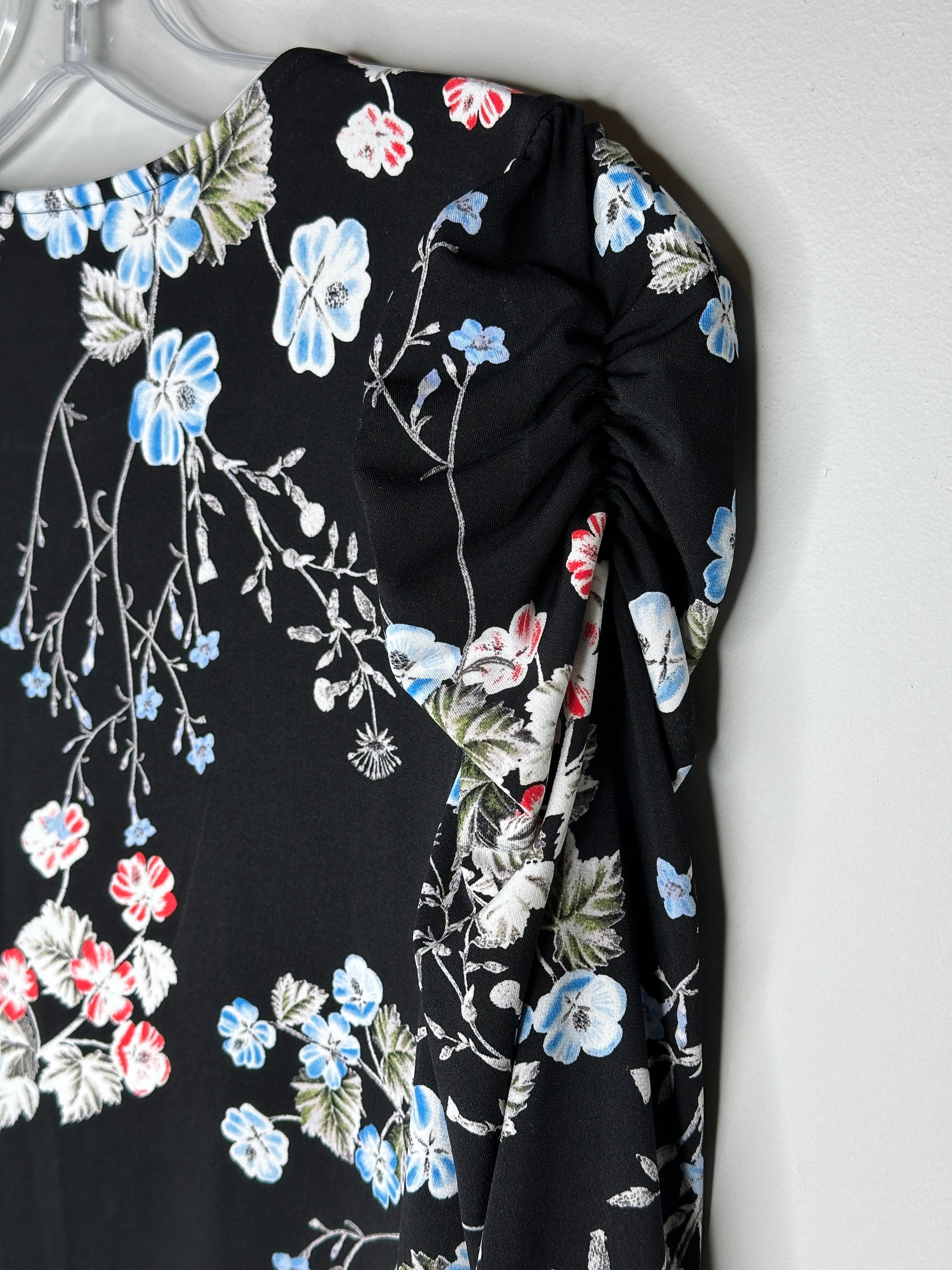 Description : A soft pullover with multi-color flowers on stretch poly fabric, three-quarter length sleeves with ruffled detailing at the shoulders and ruching down the top of the sleeve, round neckline and straight hemline. Dress up or down, great with jeans or dressier pants
