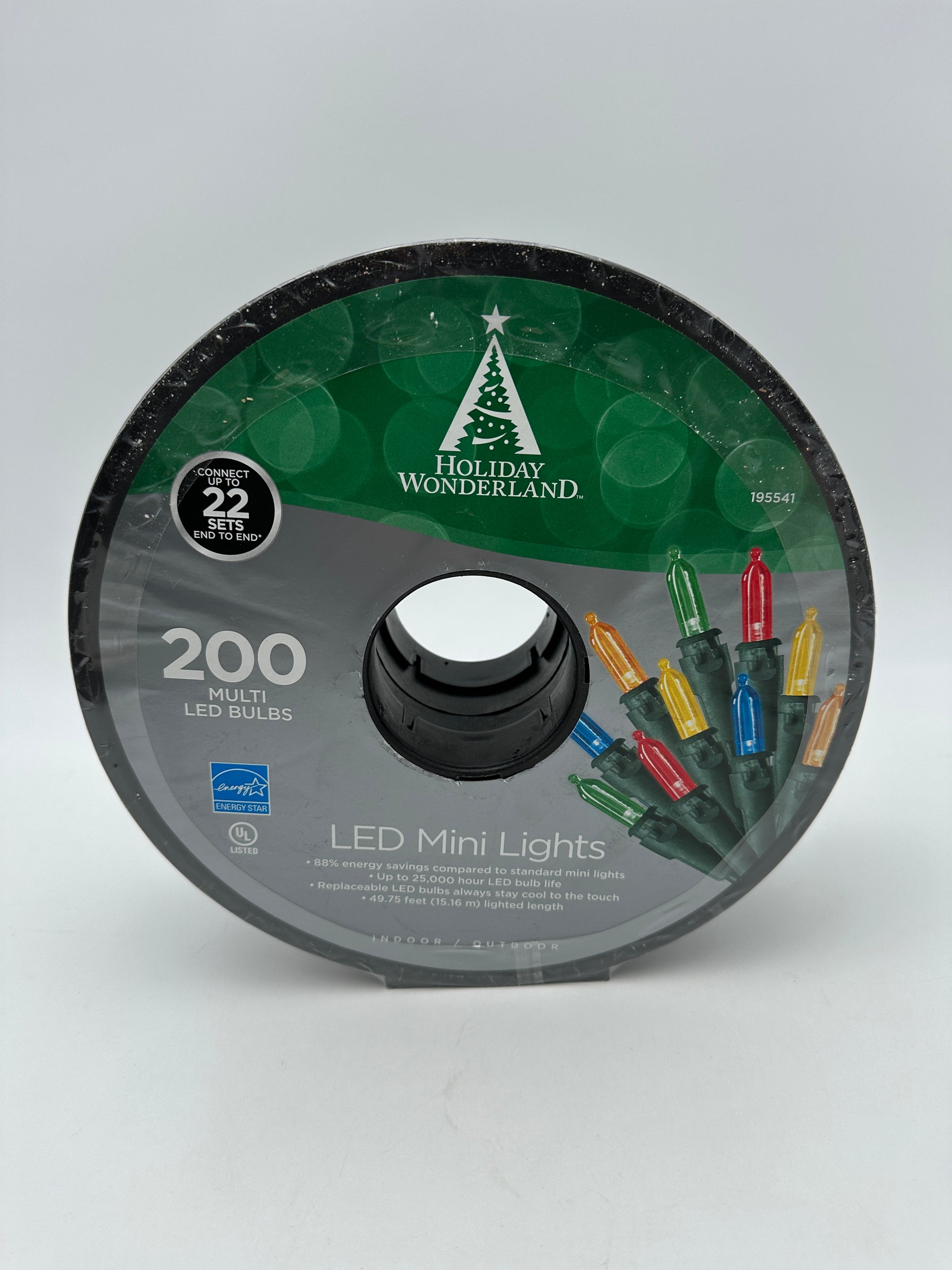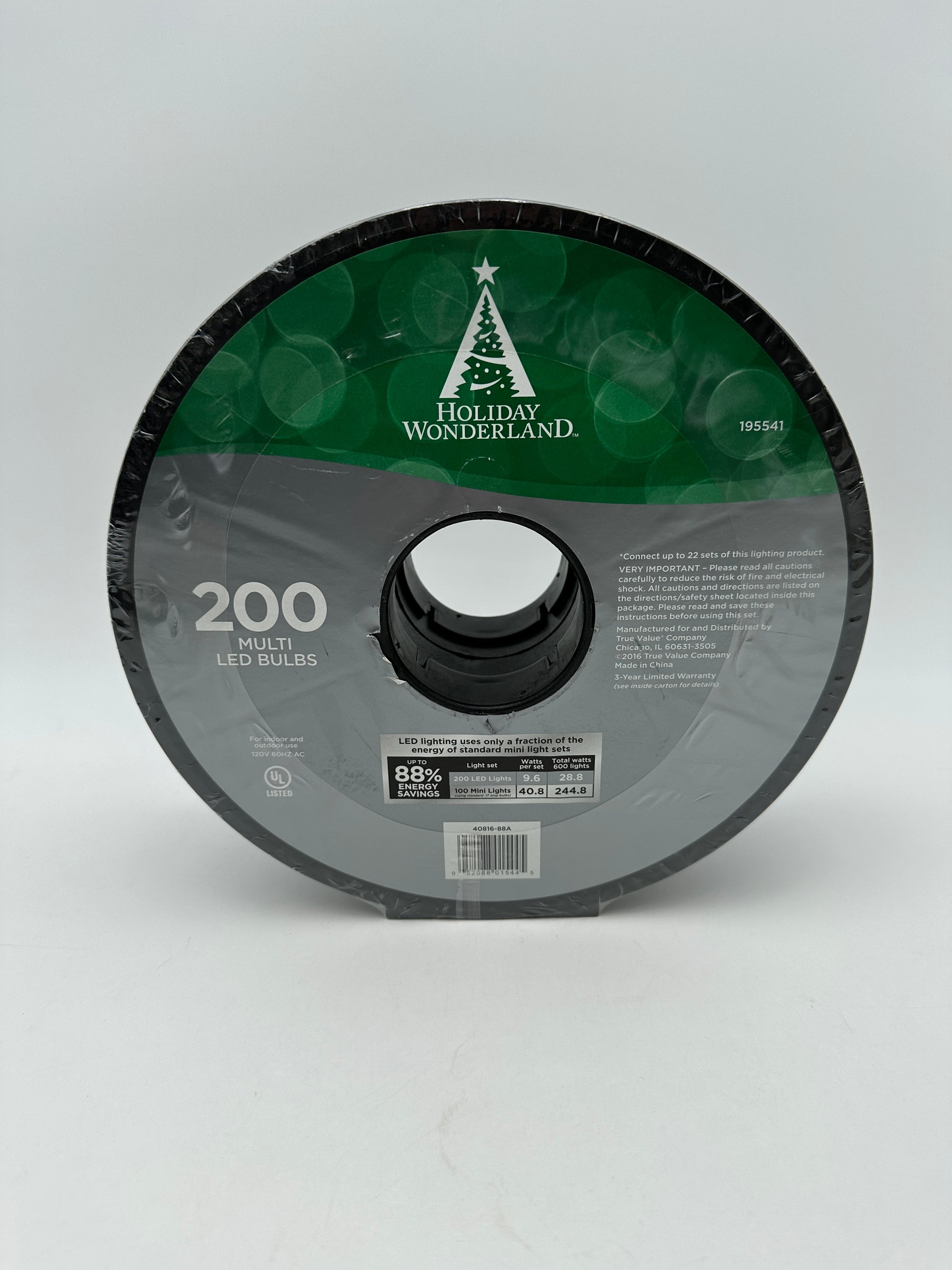 Description : For indoor/outdoor use, 88% energy savings compared to standard mini lights, up to 25,000 hour LED bulb life, replaceable LED bulbs always stay cool to the touch, 49.75 feet (15.16 m) lighted length, spaced approx. 3" apart on green wire, on a spool, item 40816-88A, new in package