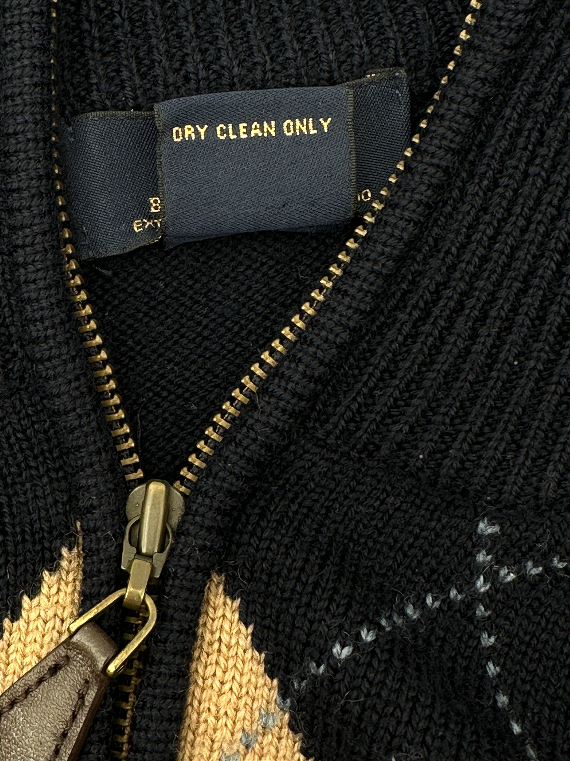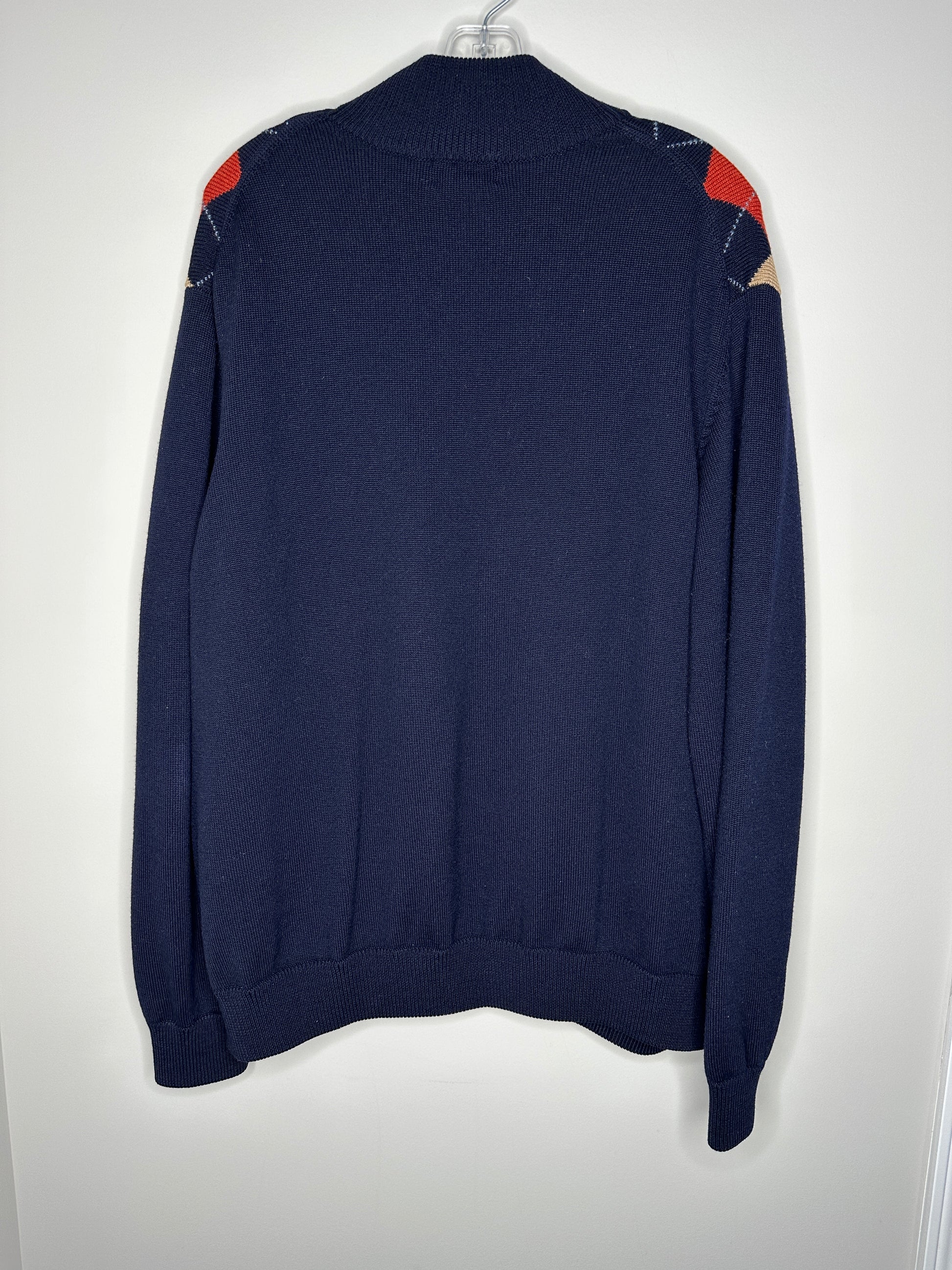 Description : A soft sweater with navy, red and tan diamonds in front, navy sleeves and back, 1/4 zip with a leather-like zipper pull and ribbing at the neck, sleeves and bottom, dry clean, in excellent condition