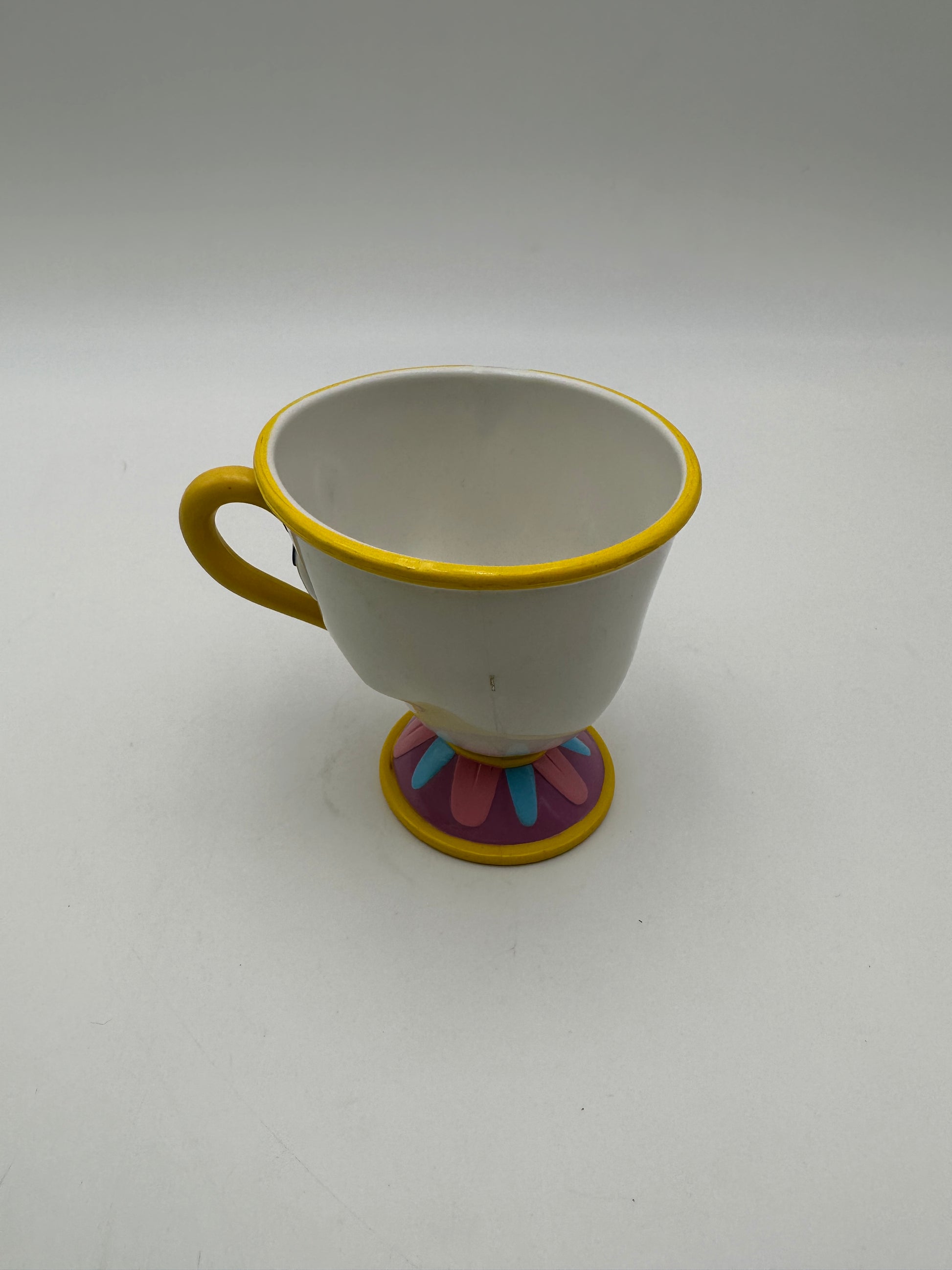 Description : A cute, handled cup, Chip from Beauty and the Beast, approx. 3 1/2" diameter at the top, 2 3/8" diameter at the bottom and 3 7/8" tall. Please note some of the photos have glare