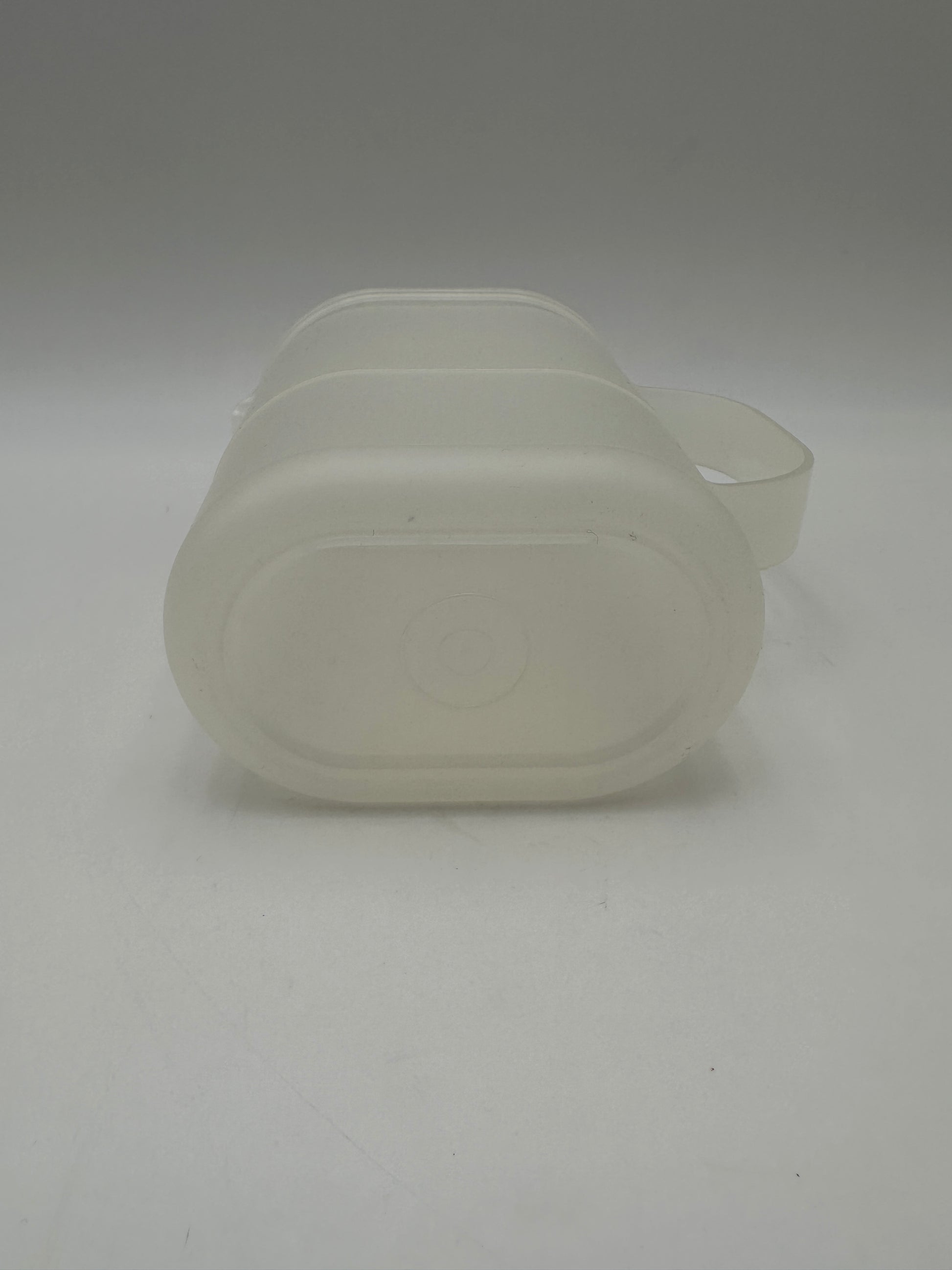 Description : The oval design fits nicely in a refrigerator door / takes up less shelf space than a round pitcher. If you wish, turn the notch in the cover/lid toward the pour spout for the open position and turn it around for the closed position. With a bit of texture on the outside. This piece has minimal or no use, measures approx. 3.5" x 5.25" (excluding handle) x 6.75" tall. Please note some of the photos have glare, ships in a poly mailer.