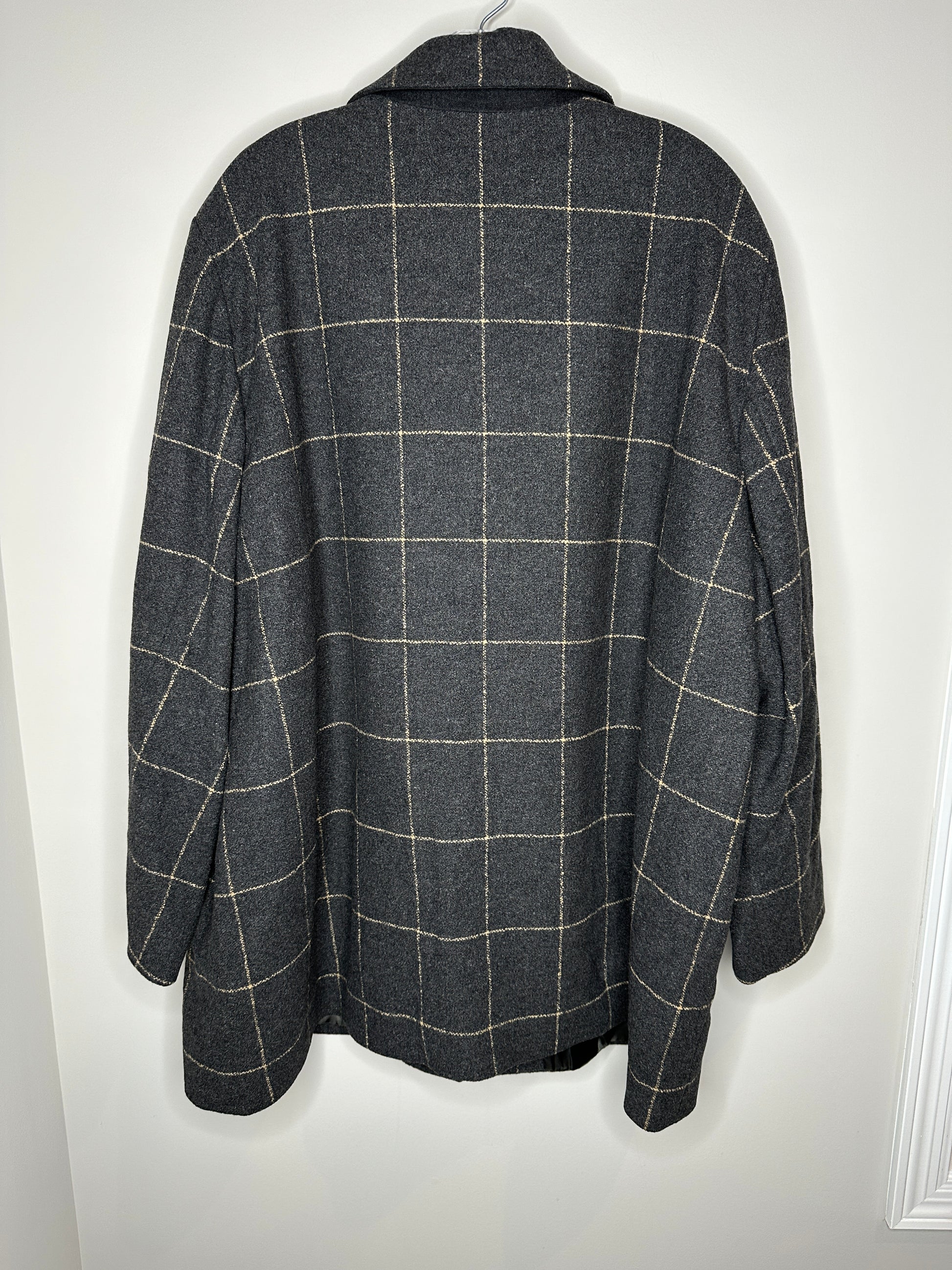 Description : Lined with a hidden front zip and snaps overtop, in a beige on dark gray windowpane pattern and faux front pockets. No size tag - please see measurements, dry clean, in excellent condition.
