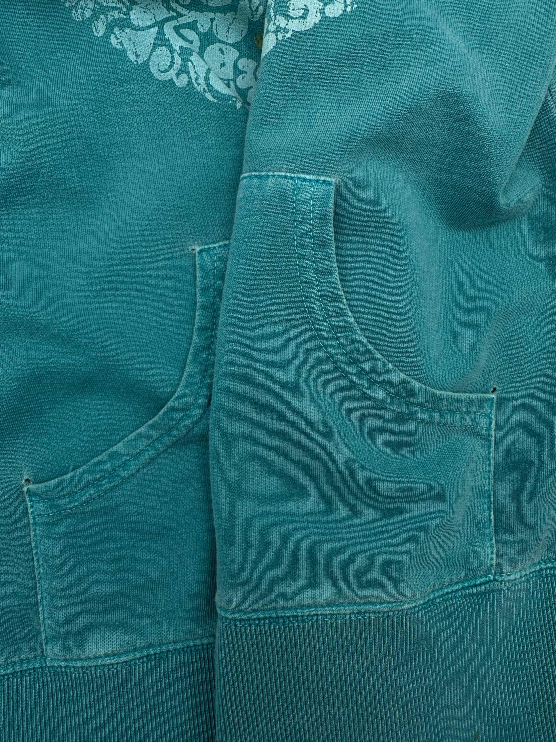 Description : A lightweight hoodie with a pattern on the front, drawstring hood, front slant pockets, silver tone zipper and a slightly distressed look. Priced for small holes at the edge of the pockets - please see photos