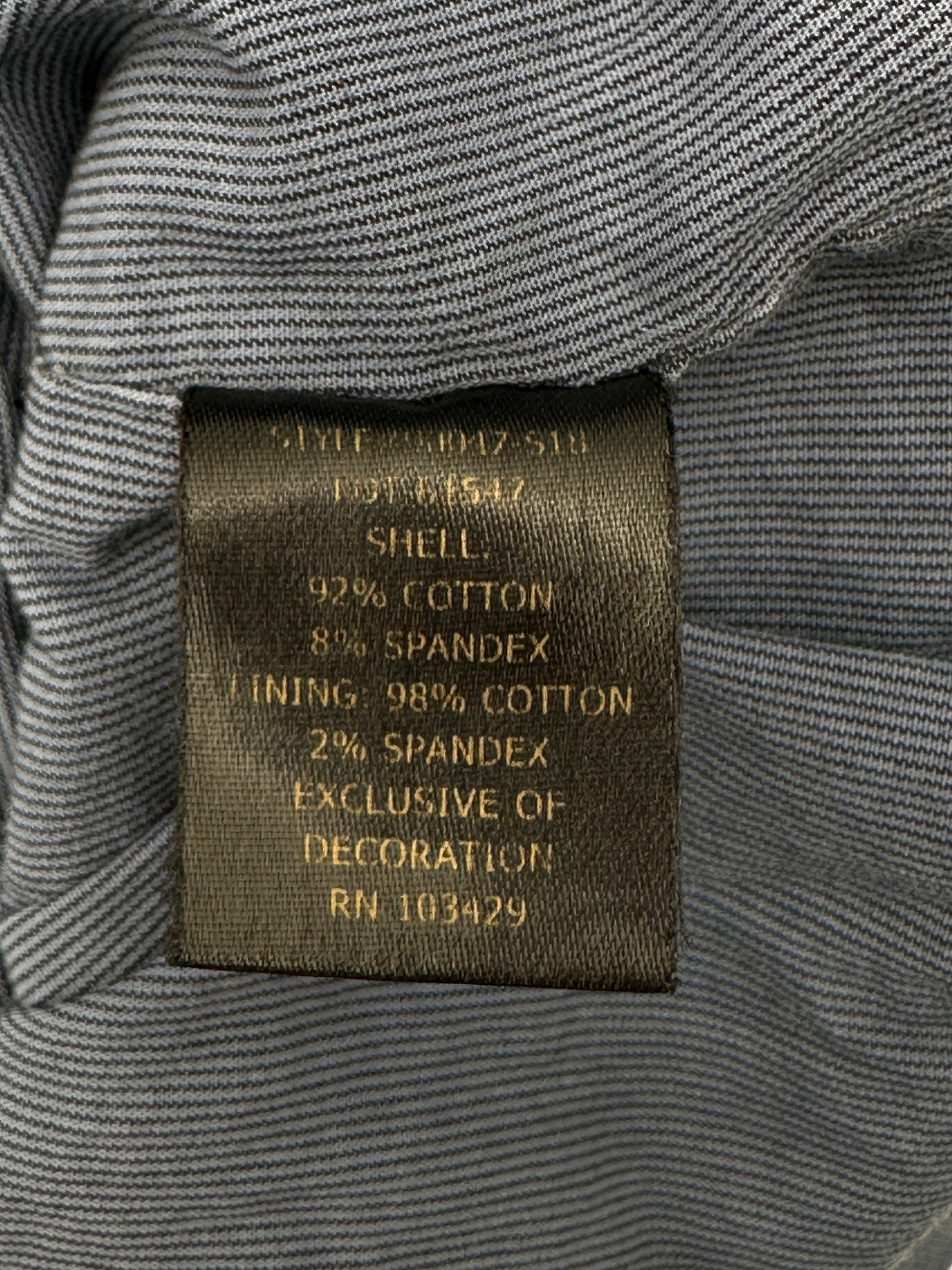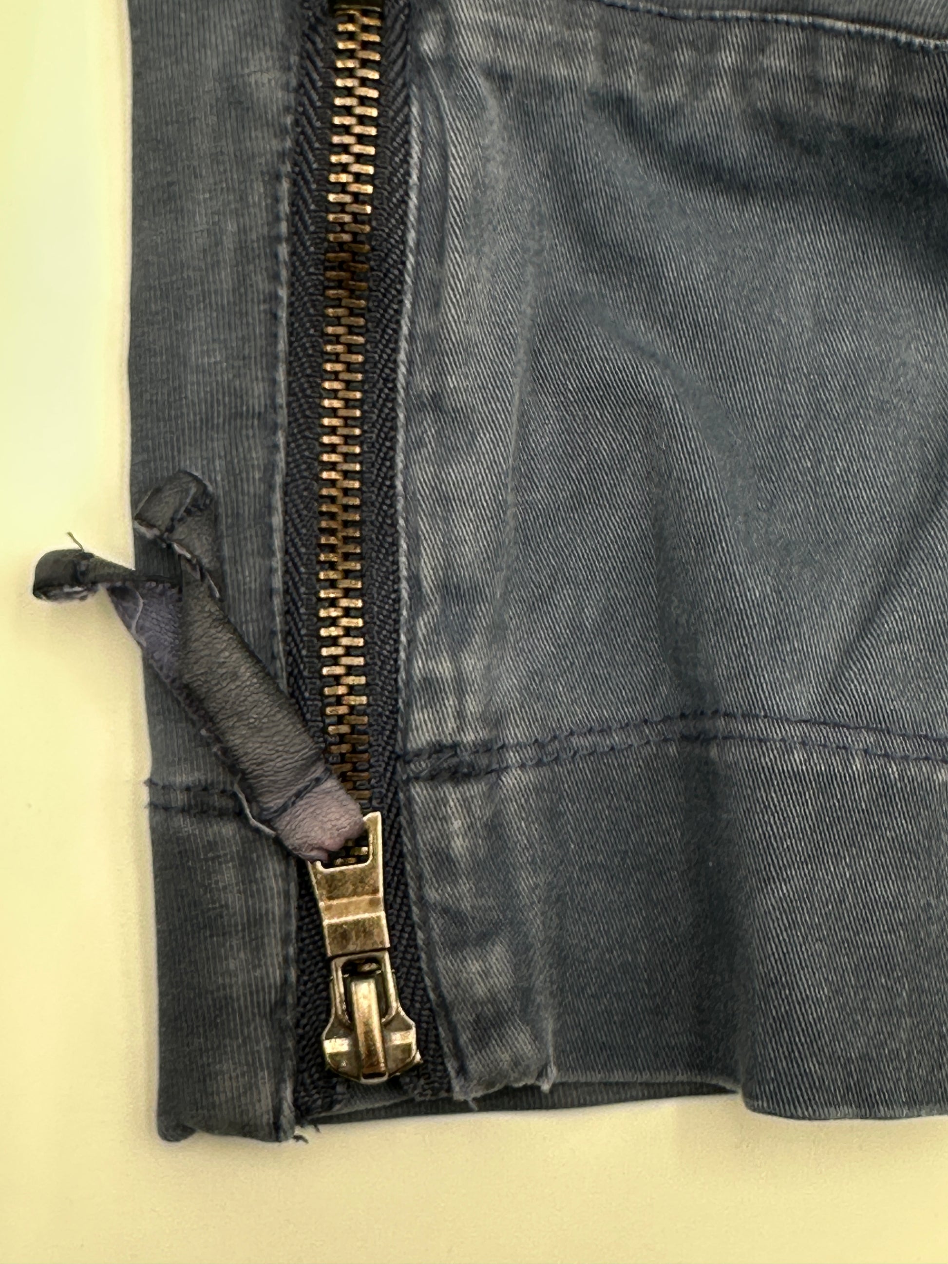 Description : A soft, distressed-look jacket with exposed zippers with leather-like pulls up the front and at the bottom of the sleeves, a mock neckline / stand up collar, 4" slit in the back and a bit of stretch. Body is lined, sleeves are not; snaps behind the front zip