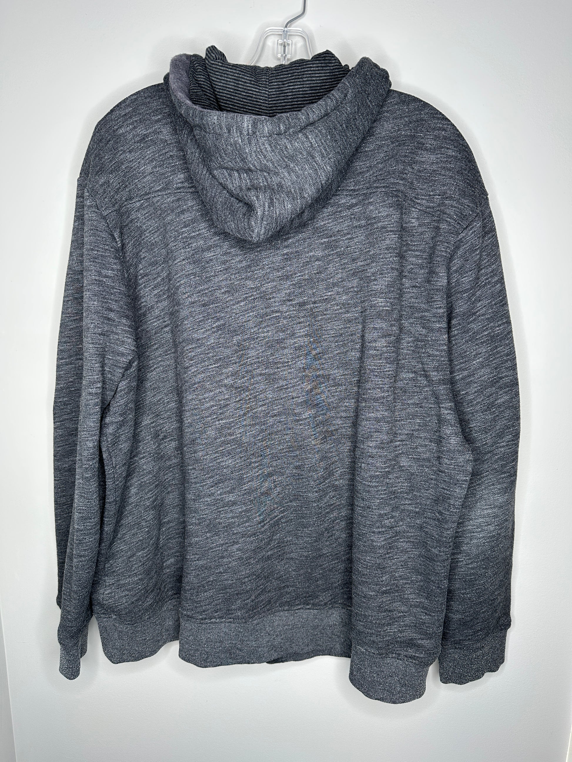 Description : Soft heathered gray with a striped lined drawstring hood, front slip pockets, ribbing at the sleeves and bottom, and sewn logo at the left chest. Priced for a small hole at the corner of the right pocket - please see photo. In versatile gray grey