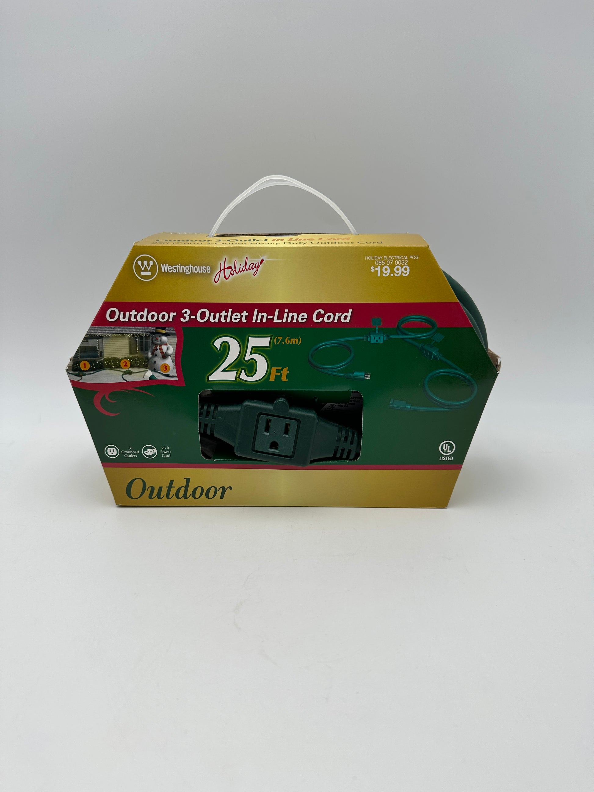 Description : 25 ft heavy duty outdoor cord, 3 outlines on a single cord, weatherproof, perfect for outdoor decorations, new in package